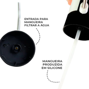 Basta encaixar a mangueira, fixar no galão e iniciar o botão para a água fluir.